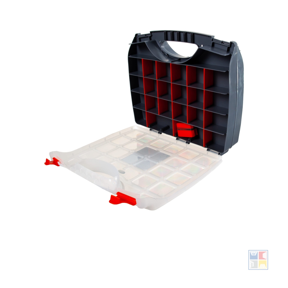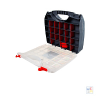 Органайзер для фурнитуры Stels 90709 двусторонний – это универсальное решение для удобного хранения крепежа, различных мелочей и аксессуаров. Корпус органайзера выполнен из прочного полипропилена, устойчивого к повреждениям. Верхняя крышка корпуса прозрачная. Внутренняя конструкция с возможностью регулировки количества и размеров секций позволяет организовать пространство по собственным нуждам. Органайзер Stels 90709 закрывается с помощью двух защелок и оборудован ручкой для комфортной транспортировки предметов.